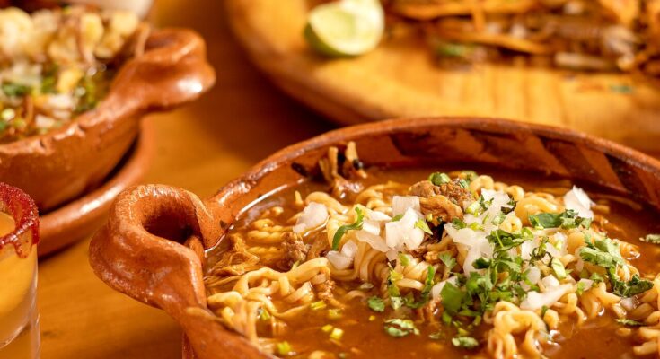 La base de este plato es un caldo espeso y lleno de sabor, cocinado a fuego lento con carne de res o chivo, la cual se deshace con facilidad y se impregna de las especias tradicionales que definen a la birria: chiles secos, ajo, cebolla y un toque de hierbas que aportan un perfil de sabor único. A este caldo se le suman los fideos ramen, que absorben cada nota del líquido, creando una textura sedosa que complementa perfectamente la intensidad del caldo.